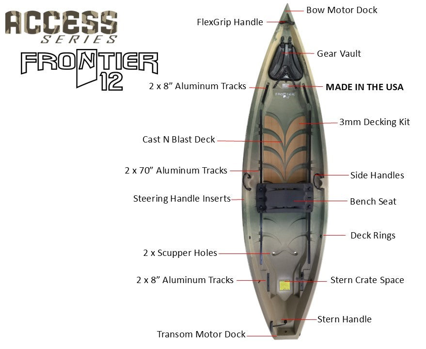 Featuring confidence-inspiring stability, ample deck space, and a high weight capacity, the F10 & Frontier 12 will give you access to more opportunities. Choose from paddle, bow or transom mount motor, or outboard motor. Lightweight and easy to transport on roof top, truck bed, or trailer. The Access Series is your workhorse on the water.