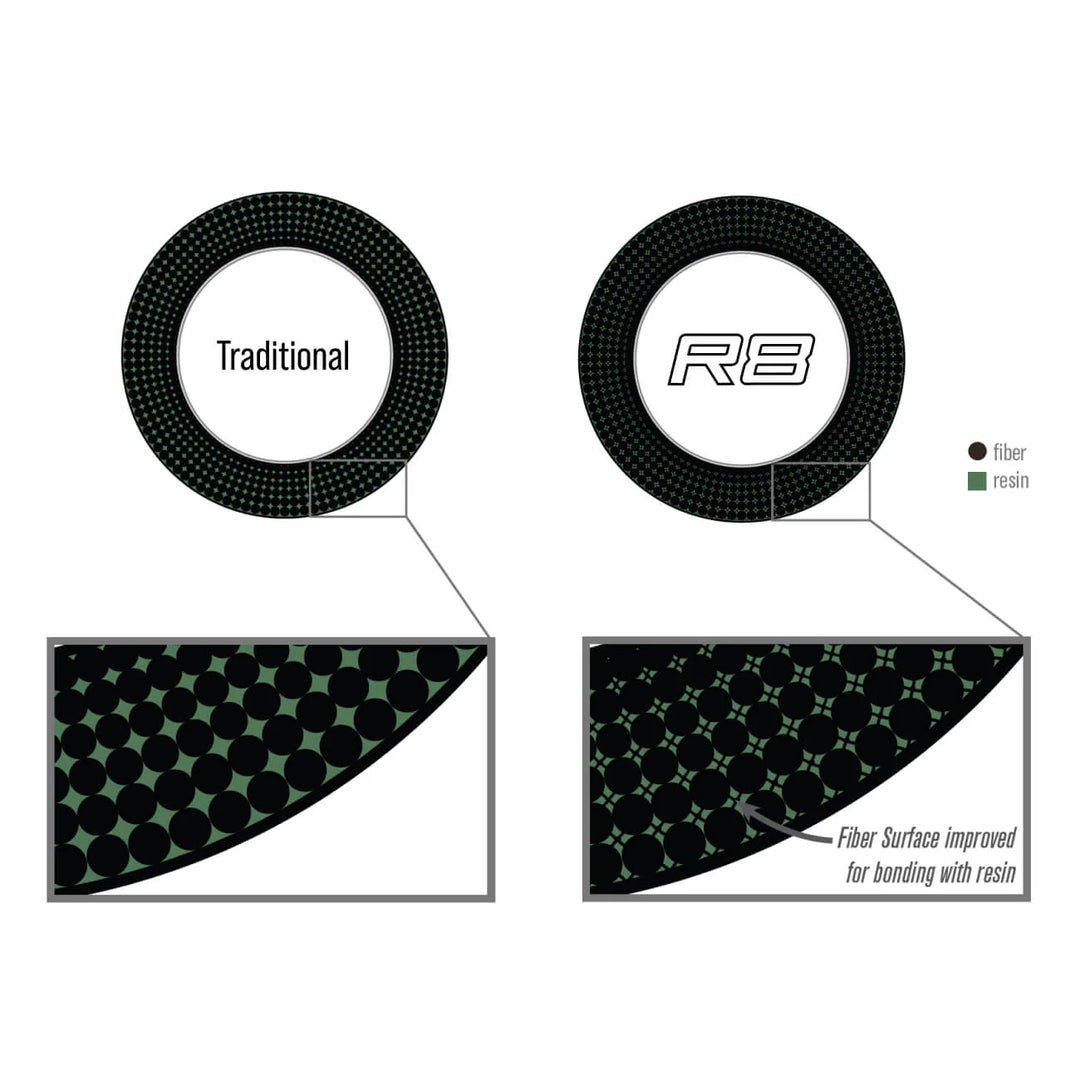 Advanced nano-sintered resin application and a more resilient axial fiber allow us to re-profile the dimensional taper to get thicker quicker from tip to butt - resulting in better energy transfer and greater feel. Simply put - a better and more efficient "wiring" of energy.